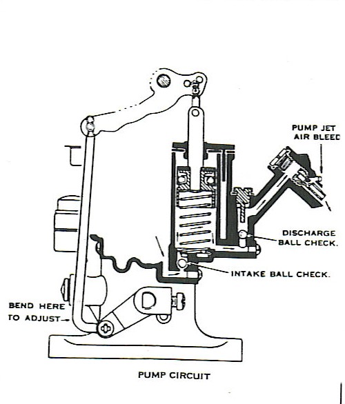 Under heavy load at part throttle and for acceleration at part throttle, a richer than normal air to fuel ratio is required. To provide this richer mixture, regardless of throttle position, the metering rod is connected to a vacuum piston. Under normal operating conditions the vacuum piston holds the metering rod down against the throttle link. When the engine vacuum drops, a spring under the vacuum piston raises the piston and metering rod, allowing more fuel to flow through the jet. As soon as the engine vacuum rises, the need for rich mixture passes and the vacuum piston returns the metering rod to normal position for mechanical operaton through the throttle linkage.
