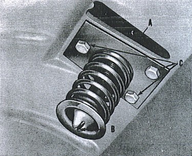 3. The up and down adjustment at the front of the hood can be amde by loosening the hood lock plunger nut at (A), Figure 103, and with a screw driver turn lock plunger (B) clockwise to decrease and counter-clockwise to increase. After adjustments are made, tighten plunger lock nut securely.